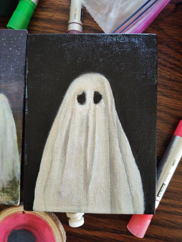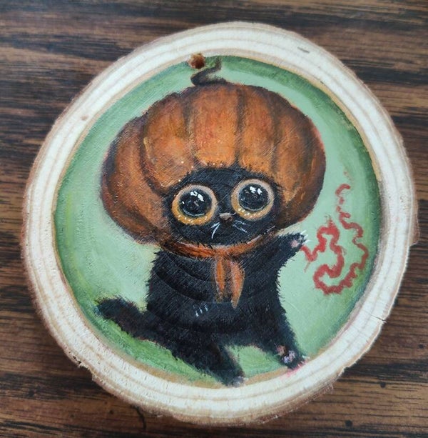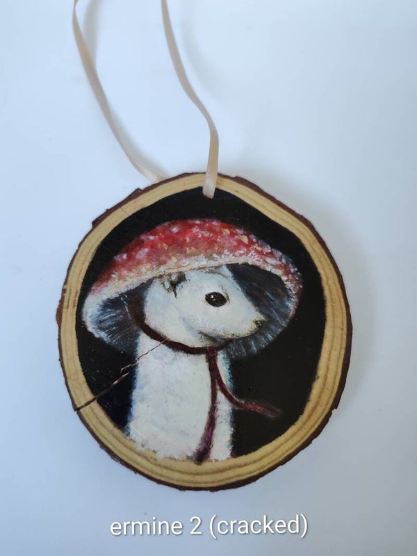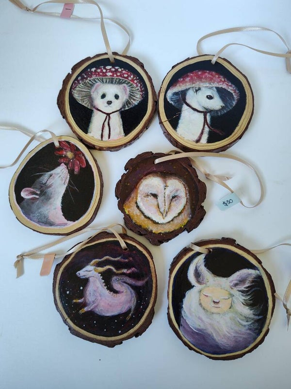 Wooden Rounds: Hand painted with acrylic on little wooden slices. All sealed with a matte varnish. See bottom left for number if there are multiples of the subject.