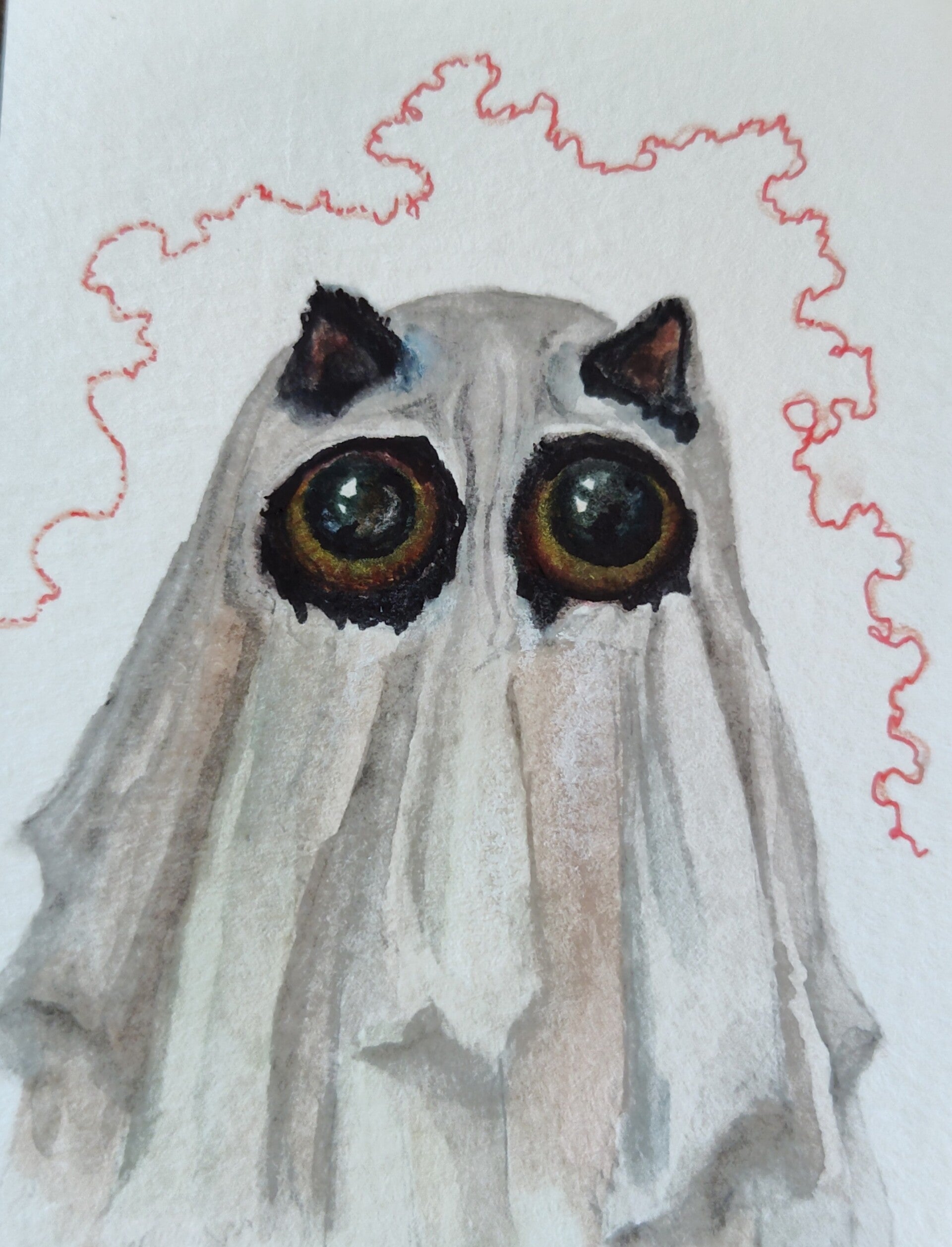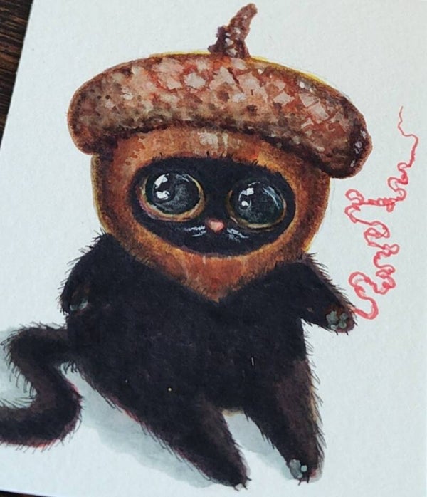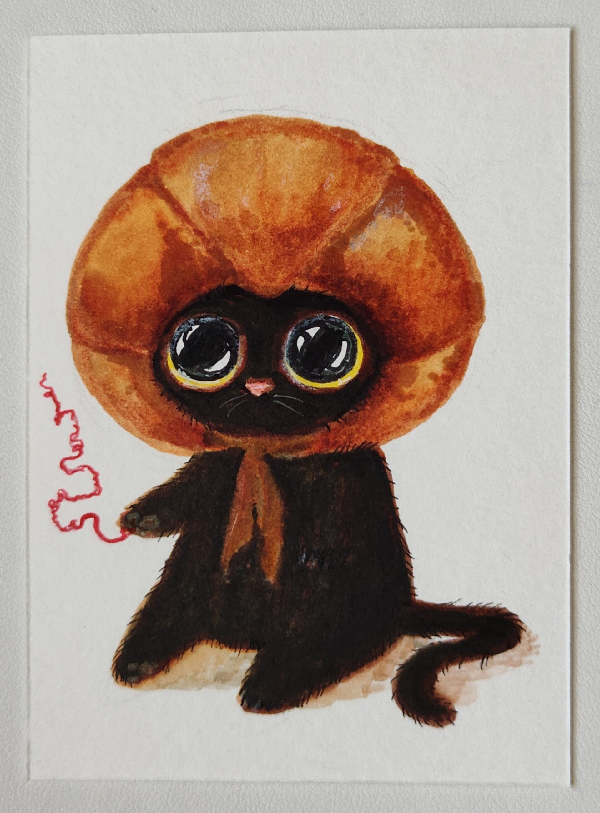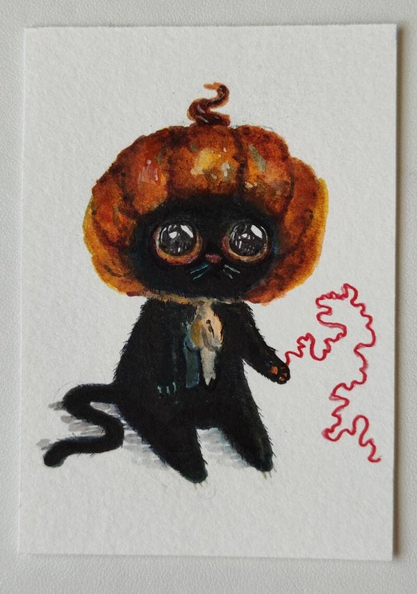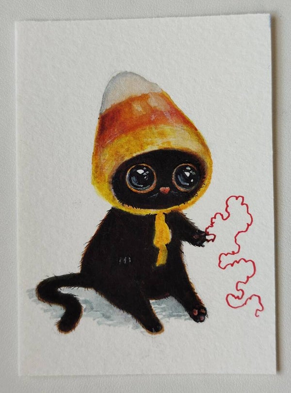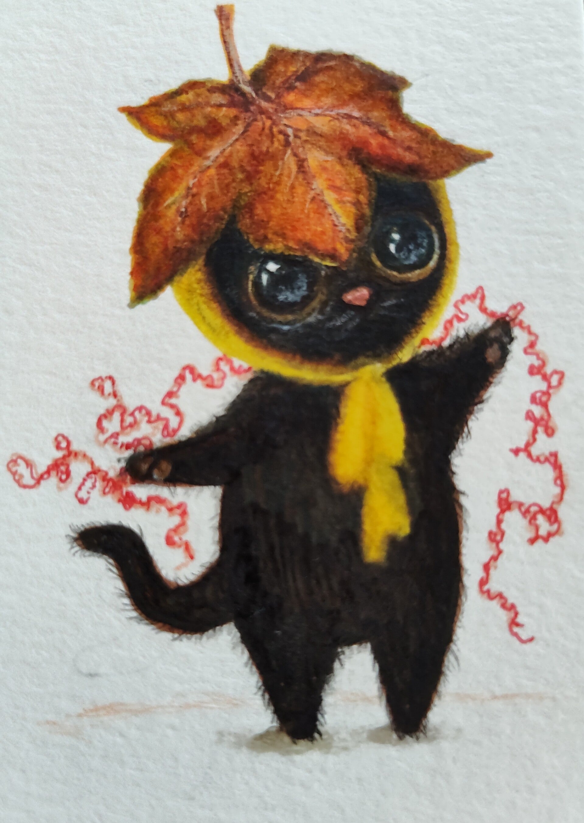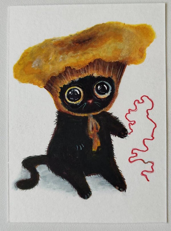 A little kitty fashion designer created hats for her fall collection. Each kitty has a little red string which represents longing for connection. These are approx. 2.5 x 3.5 (cut by hand) mixed media paintings. Done on heavy watercolor paper.